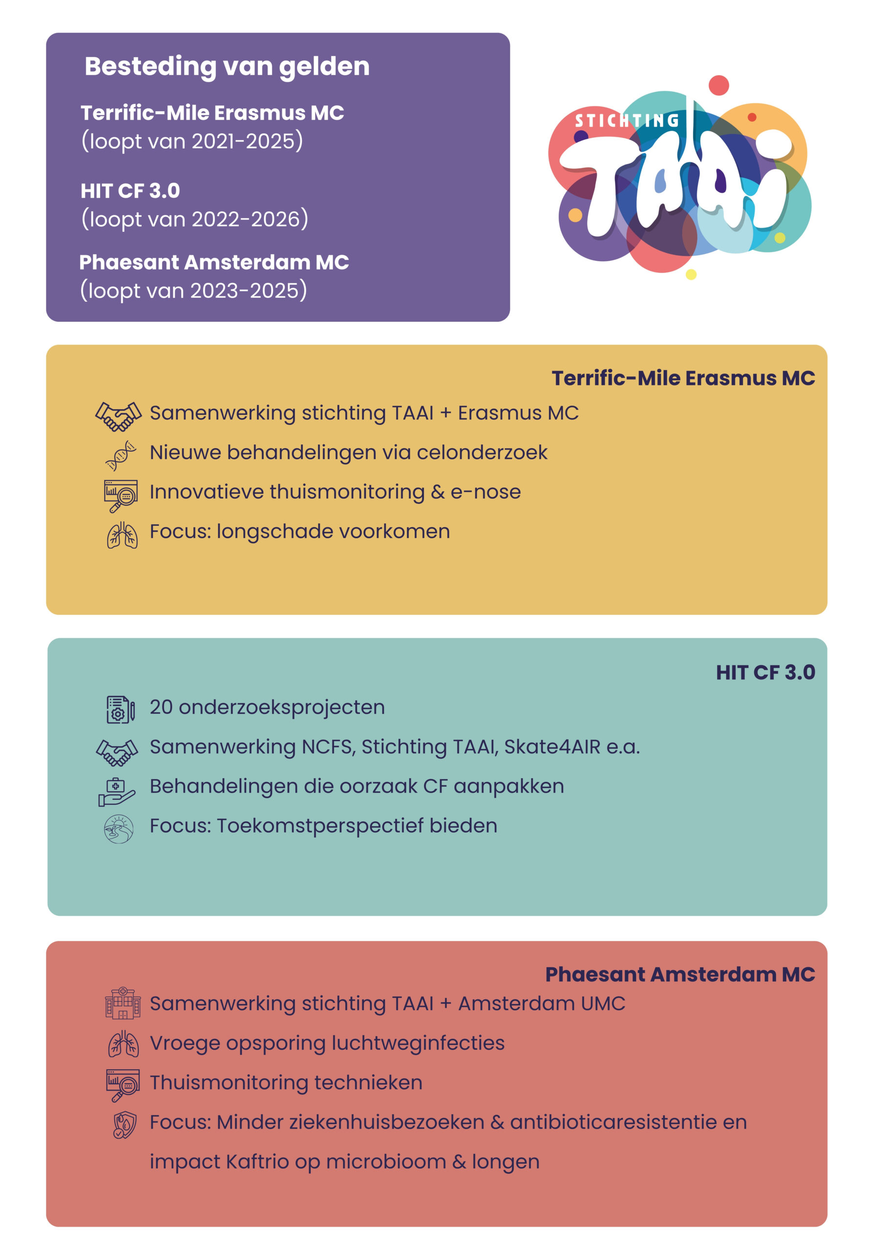 De laatste ontwikkelingen op het gebied van nieuwe medicijnen voor CF zijn hoopvol. Om deze ontwikkelingen te versterken en te versnellen, zet Stichting TAAI zich in samenwerking met CF centra en de Nederlandse Cystic Fibrosis Stichting in om baanbrekend onderzoek te ondersteunen. Eén jaar na de oprichting is Stichting TAAI een samenwerking aangegaan met het Erasmus MC en is het TERRIFIC onderzoek van start gegaan om vervolgens in het tweede jaar diverse onderzoeken van het HIT CF 3.0 programma van de NCFS te ondersteunen. Eind 2022 heeft TAAI een subsidie toegekend aan het Phaesant project, dit keer in samenwerking met AMC.